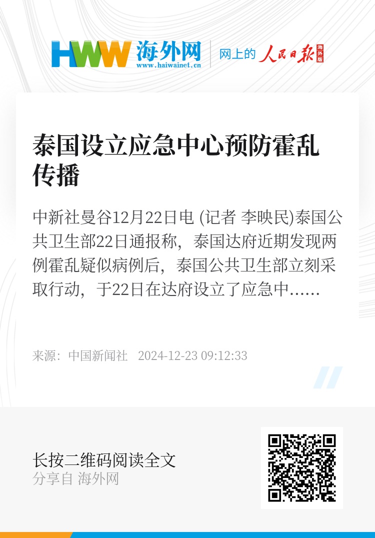 中新社曼谷12月22日电 (记者 李映民)泰国公共卫生部22日通报称,泰国达府近期发现两例霍乱疑似病例后,泰国公共卫生部立刻采取行动,于22日在达府设立了应急中心,以监测边境霍乱疫情并尽量减少其影响。