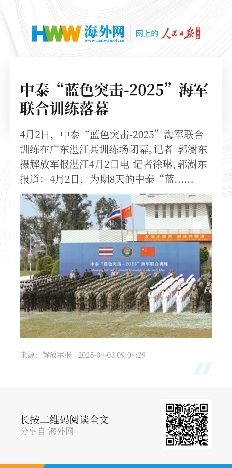 解放军报湛江4月2日电 记者徐琳、郭澍东报道:4月2日,为期8天的中泰“蓝色突击-2025”海军联合训练,完成预定科目训练任务后落下帷幕。中泰双方在广东湛江某训练场举行闭幕式,双方指挥员分别致辞,并为优秀队员颁发了奖章和证书。