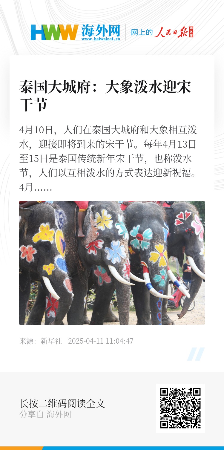 4月10日,人们在泰国大城府和大象相互泼水,迎接即将到来的宋干节。每年4月13日至15日是泰国传统新年宋干节,也称泼水节,人们以互相泼水的方式表达迎新祝福。