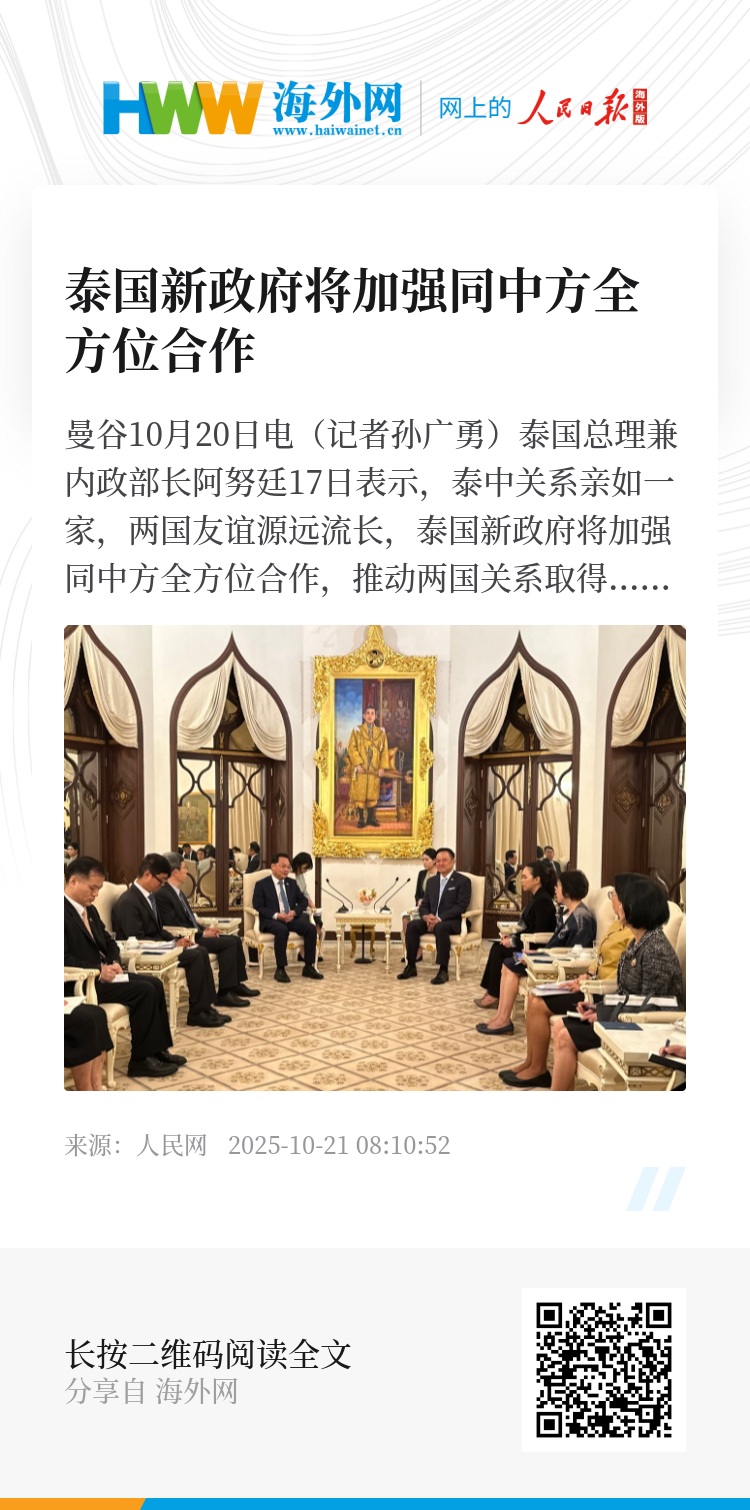 人民网曼谷10月20日电(记者孙广勇)泰国总理兼内政部长阿努廷17日表示,泰中关系亲如一家,两国友谊源远流长,泰国新政府将加强同中方全方位合作,推动两国关系取得更大发展、两国人民友谊更加牢固。