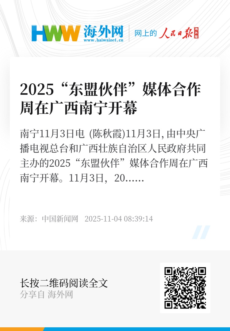 中新网南宁11月3日电 (陈秋霞)11月3日,由中央广播电视总台和广西壮族自治区人民政府共同主办的2025“东盟伙伴”媒体合作周在广西南宁开幕。
