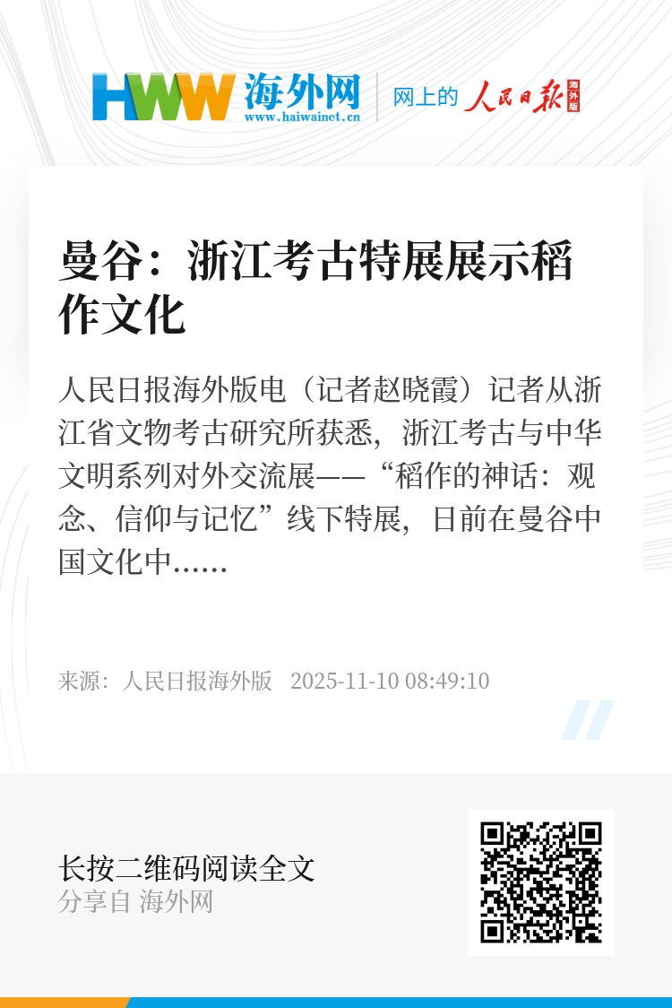 人民日报海外版电(记者赵晓霞)记者从浙江省文物考古研究所获悉,浙江考古与中华文明系列对外交流展——“稻作的神话:观念、信仰与记忆”线下特展,日前在曼谷中国文化中心举办,为中泰建交50周年增添文化亮色。