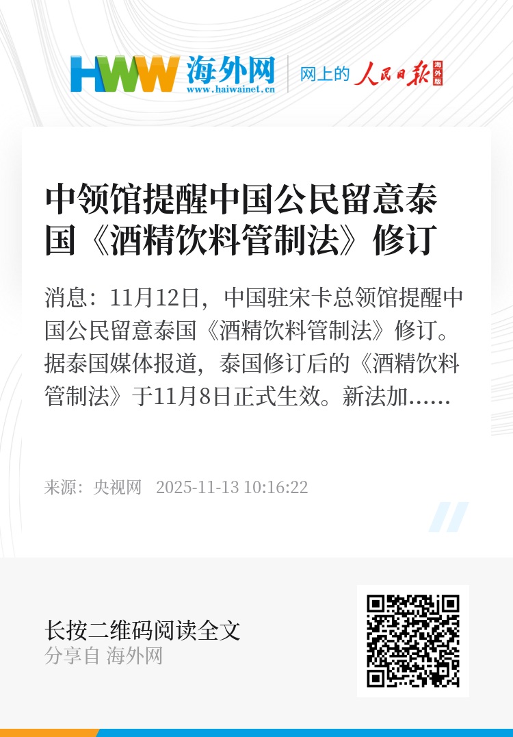据泰国媒体报道,泰国修订后的《酒精饮料管制法》于11月8日正式生效。新法加强了执法力度,进一步收紧了酒类销售、广告和饮用时间的管理,首次将处罚重点转移至消费者本人。根据新规,个人若在禁售时段(下午2点至5点)或禁售场所内饮酒、接受酒水服务,将被处以最高1万泰铢(约合300美元)的罚款。总领馆提醒赴泰南地区旅行的中国公民,留意有关法规变化,避免遭受不必要损失。