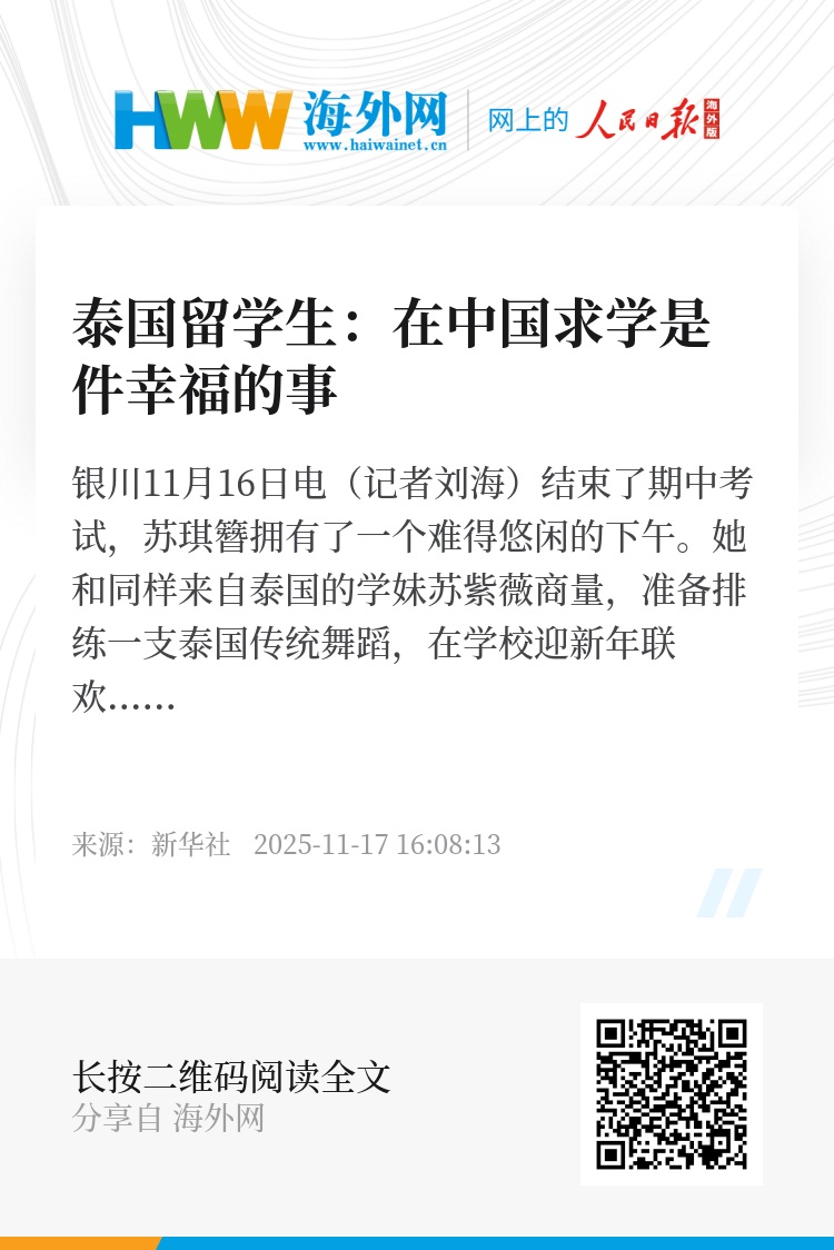 新华社银川11月16日电(记者刘海)结束了期中考试,苏琪簪拥有了一个难得悠闲的下午。她和同样来自泰国的学妹苏紫薇商量,准备排练一支泰国传统舞蹈,在学校迎新年联欢晚会上为大家展示。