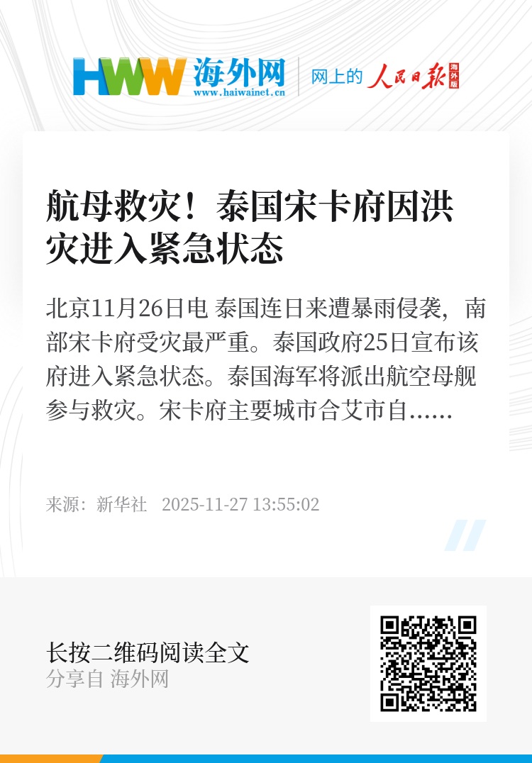 新华社北京11月26日电 泰国连日来遭暴雨侵袭,南部宋卡府受灾最严重。泰国政府25日宣布该府进入紧急状态。泰国海军将派出航空母舰参与救灾。