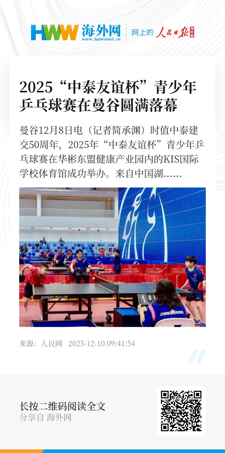 人民网曼谷12月8日电(记者简承渊)时值中泰建交50周年,2025年“中泰友谊杯”青少年乒乓球赛在华彬东盟健康产业园内的KIS国际学校体育馆成功举办。来自中国湖北和陕西的25名优秀青少年选手和25位泰国精英运动员同场竞技,历经两天的激烈角逐,赛事于7日圆满落幕。作为中泰建交50周年的重要体育文化交流活动之一,本次赛事响应共建“一带一路”倡议号召,旨在以乒乓球为纽带,搭建两国青少年友好合作的桥梁。泰国旅游与体育部部长阿塔功·西里拉特塔亚功、中国驻泰国大使张建卫、泰国乒乓球协会会长纳塔武·鲁昂威沙、华彬集团执行总裁严丹骅、华彬文化基金会理事长张薇出席了6日的开幕式。