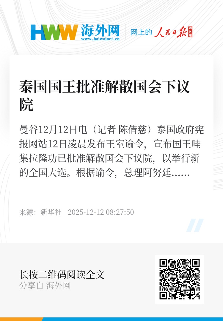 新华社曼谷12月12日电(记者 陈倩慈)泰国政府宪报网站12日凌晨发布王室谕令,宣布国王哇集拉隆功已批准解散国会下议院,以举行新的全国大选。