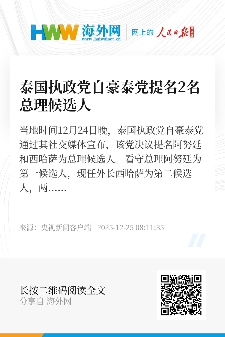 当地时间12月24日晚,泰国执政党自豪泰党通过其社交媒体宣布,该党决议提名阿努廷和西哈萨为总理候选人。看守总理阿努廷为第一候选人,现任外长西哈萨为第二候选人,两人均已接受提名。