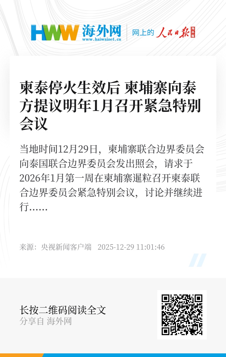 当地时间12月29日,柬埔寨联合边界委员会向泰国联合边界委员会发出照会,请求于2026年1月第一周在柬埔寨暹粒召开柬泰联合边界委员会紧急特别会议,讨论并继续进行勘测和边界工作。