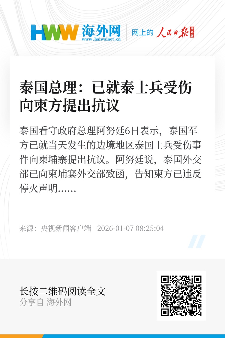 当天早些时候,泰国陆军第二军区在社交媒体上发文说,柬方违反停火声明,当天7时25分许在边境地区发射榴弹,造成一名泰国士兵受伤。