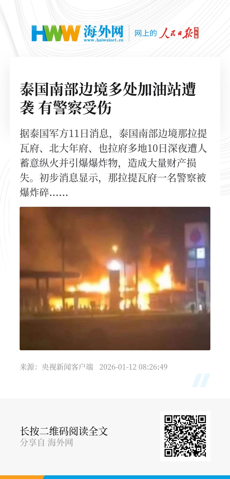 泰国第四军区内部安全行动指挥部通过社交媒体发布公告说,纵火和爆炸事件发生在北大年府2个加油站、也拉府4个加油站、那拉提瓦府5个加油站。地方政府建议当地居民暂时留在住所,避免前往加油站。军方要求辖区内及周边所有单位将安保级别提升至最高,以保障民众安全,并加紧追捕肇事者。(总台记者 宋焕钰)