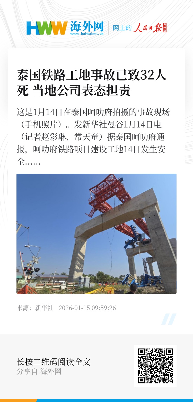 新华社曼谷1月14日电(记者赵彩琳、常天童)据泰国呵叻府通报,呵叻府铁路项目建设工地14日发生安全事故,已造成32人死亡、66人受伤,另有3人失踪。救援工作正在进行中。