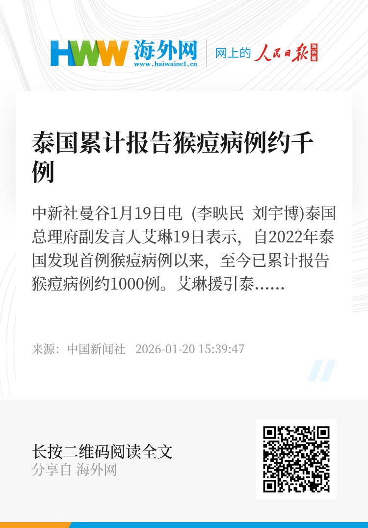 中新社曼谷1月19日电 (李映民 刘宇博)泰国总理府副发言人艾琳19日表示,自2022年泰国发现首例猴痘病例以来,至今已累计报告猴痘病例约1000例。
