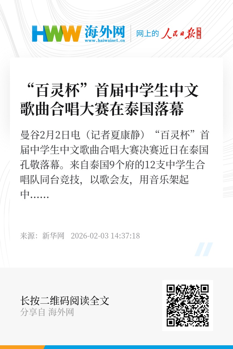 新华网曼谷2月2日电(记者夏康静)“百灵杯”首届中学生中文歌曲合唱大赛决赛近日在泰国孔敬落幕。来自泰国9个府的12支中学生合唱队同台竞技,以歌会友,用音乐架起中泰人文交流之桥。