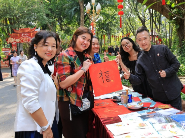 参加春节招待会的泰国友人展示现场创作的书法作品。人民网记者 白元琪摄