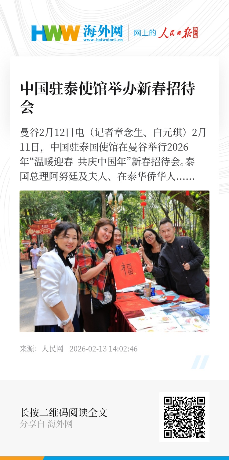 人民网曼谷2月12日电(记者章念生、白元琪)2月11日,中国驻泰国使馆在曼谷举行2026年“温暖迎春 共庆中国年”新春招待会。泰国总理阿努廷及夫人、在泰华侨华人、中资机构人员、留学生代表等700余人出席活动。