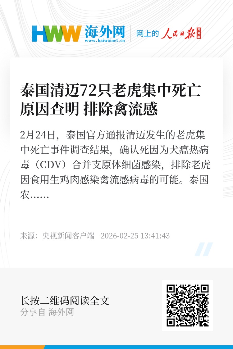 2月24日,泰国官方通报清迈发生的老虎集中死亡事件调查结果,确认死因为犬瘟热病毒(CDV)合并支原体细菌感染,排除老虎因食用生鸡肉感染禽流感病毒的可能。