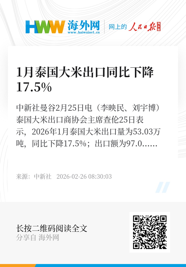 中新社曼谷2月25日电(李映民、刘宇博)泰国大米出口商协会主席查伦25日表示,2026年1月泰国大米出口量为53.03万吨,同比下降17.5%;出口额为97.07亿泰铢,同比下降30.7%。