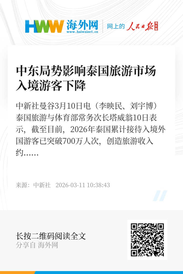 中新社曼谷3月10日电(李映民、刘宇博)泰国旅游与体育部常务次长塔威翁10日表示,截至目前,2026年泰国累计接待入境外国游客已突破700万人次,创造旅游收入约3560亿泰铢。受中东地区局势紧张影响,远距离客源地游客数量较此前减少约13%。最近一周入境外国游客数量环比下降近9%,预计下周整体规模将趋于稳定。