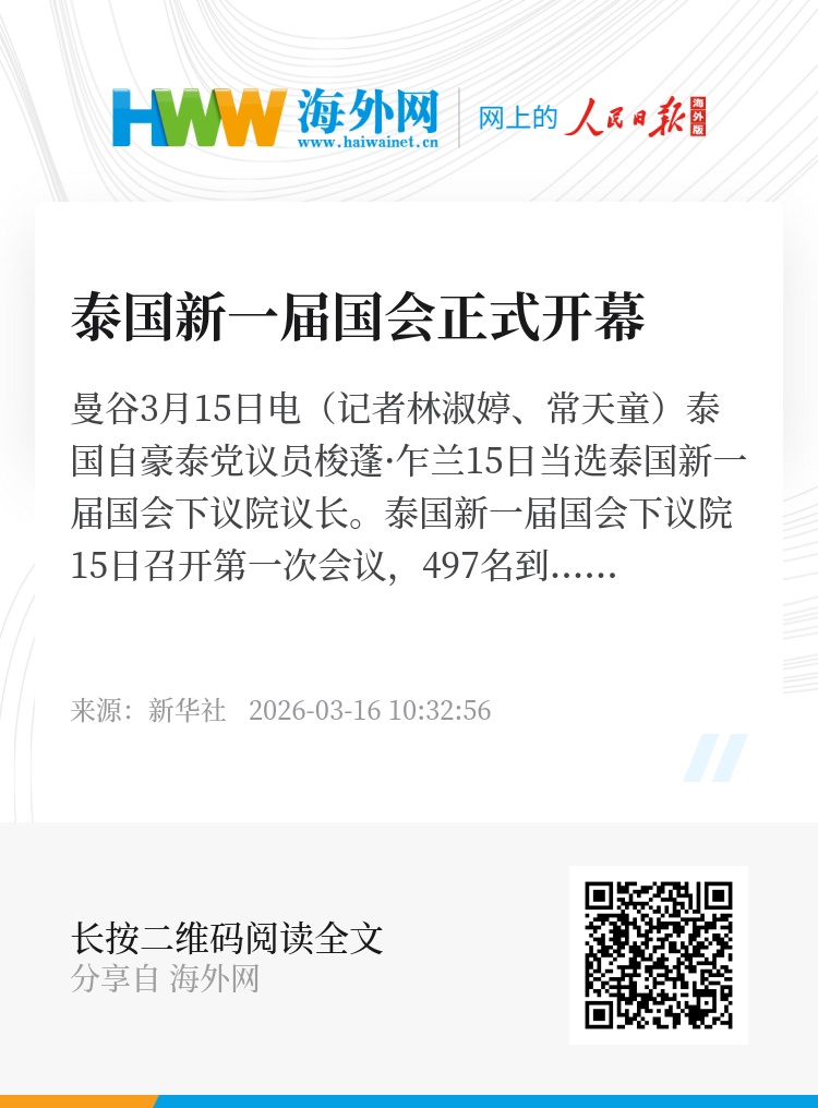 新华社曼谷3月15日电(记者林淑婷、常天童)泰国自豪泰党议员梭蓬·乍兰15日当选泰国新一届国会下议院议长。