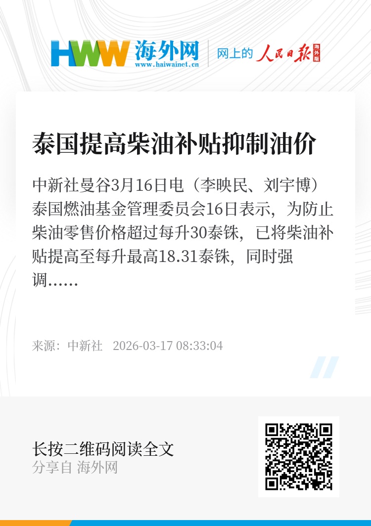 中新社曼谷3月16日电(李映民、刘宇博)泰国燃油基金管理委员会16日表示,为防止柴油零售价格超过每升30泰铢,已将柴油补贴提高至每升最高18.31泰铢,同时强调该措施仅为临时性安排。