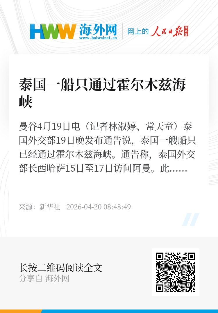 新华社曼谷4月19日电(记者林淑婷、常天童)泰国外交部19日晚发布通告说,泰国一艘船只已经通过霍尔木兹海峡。