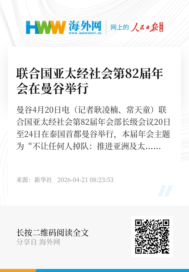 新华社曼谷4月20日电(记者耿凌楠、常天童)联合国亚太经社会第82届年会部长级会议20日至24日在泰国首都曼谷举行,本届年会主题为“不让任何人掉队:推进亚洲及太平洋不分年龄人人共享的社会”。